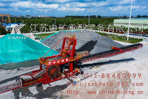 該設(shè)備包括行走機(jī)構(gòu);鏈板進(jìn)料裝置;帶式輸送機(jī)系統(tǒng);臂架俯仰機(jī)構(gòu);臂架旋轉(zhuǎn)機(jī)構(gòu);卡車爬坡裝置;液壓系統(tǒng);控制系統(tǒng);配電系統(tǒng)(移動式電站)等。全部系統(tǒng)可以在堆場場地內(nèi)移動,行走機(jī)構(gòu)的行走輪采用重載汽車實心輪胎,無須在堆場內(nèi)布置固定軌道,增加堆場利用率;進(jìn)料裝置與輸送懸臂集為一體,二者均安裝于一個公共底盤之上,構(gòu)成一體式移動堆高機(jī);臂架俯仰機(jī)構(gòu)采用鋼絲繩俯仰形式,臂架旋轉(zhuǎn)機(jī)構(gòu)采用回轉(zhuǎn)減速電機(jī)和回轉(zhuǎn)軸承,配電系統(tǒng)采用發(fā)電機(jī)組和電纜卷筒供電,整個系統(tǒng)具有完整地獨立性。