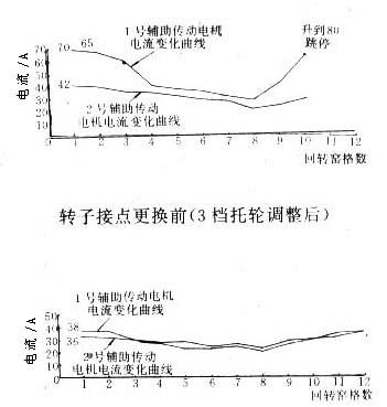 (4)主傳動(dòng)2號(hào)主電機(jī),已多次發(fā)生過(guò)碳刷整排燒壞事故。主要原因是整流子磨損嚴(yán)重,換向困難,造成幾何中心線偏移,電流分布不均衡,電機(jī)帶病運(yùn)行。