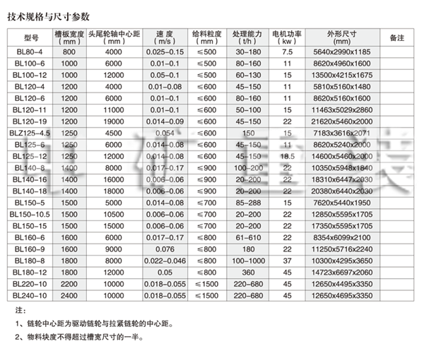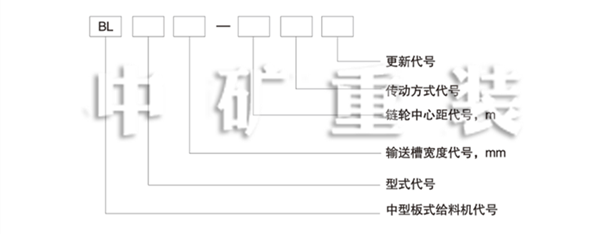 標記示例:輸送播寬度B為1600mm,形式為L型,鏈輪中心距L為15m,右傳動方式的通用固定式中型板式給料機標記為:板式給料機 BL1600-15 I JB/T4255—1999